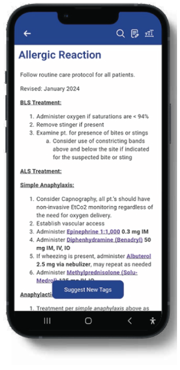 EMS Protocols To-Go offers a mobile-friendly interface that allows EMS providers to quickly and easily find the right protocols wherever they are, using a high-end search algorithm that significantly reduces search time, even in high-pressure situations.